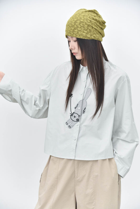 早秋 NEW/ 『伸伸懶腰貓咪』刺繡襯衫