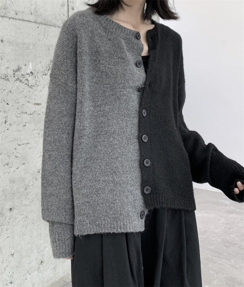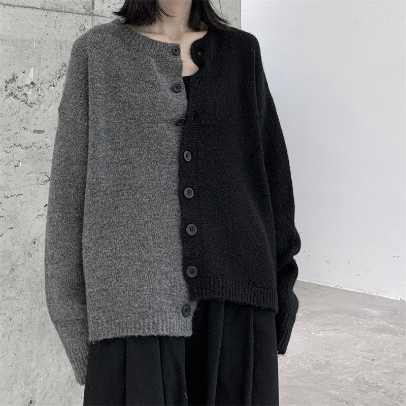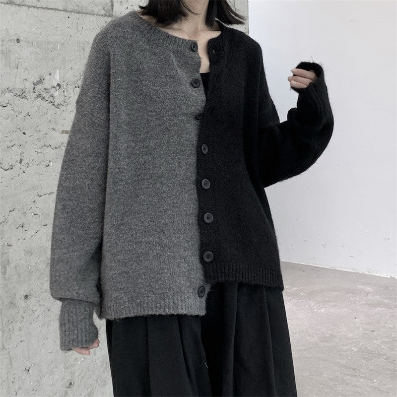 情侶款寬鬆黑灰拼接毛衣外套